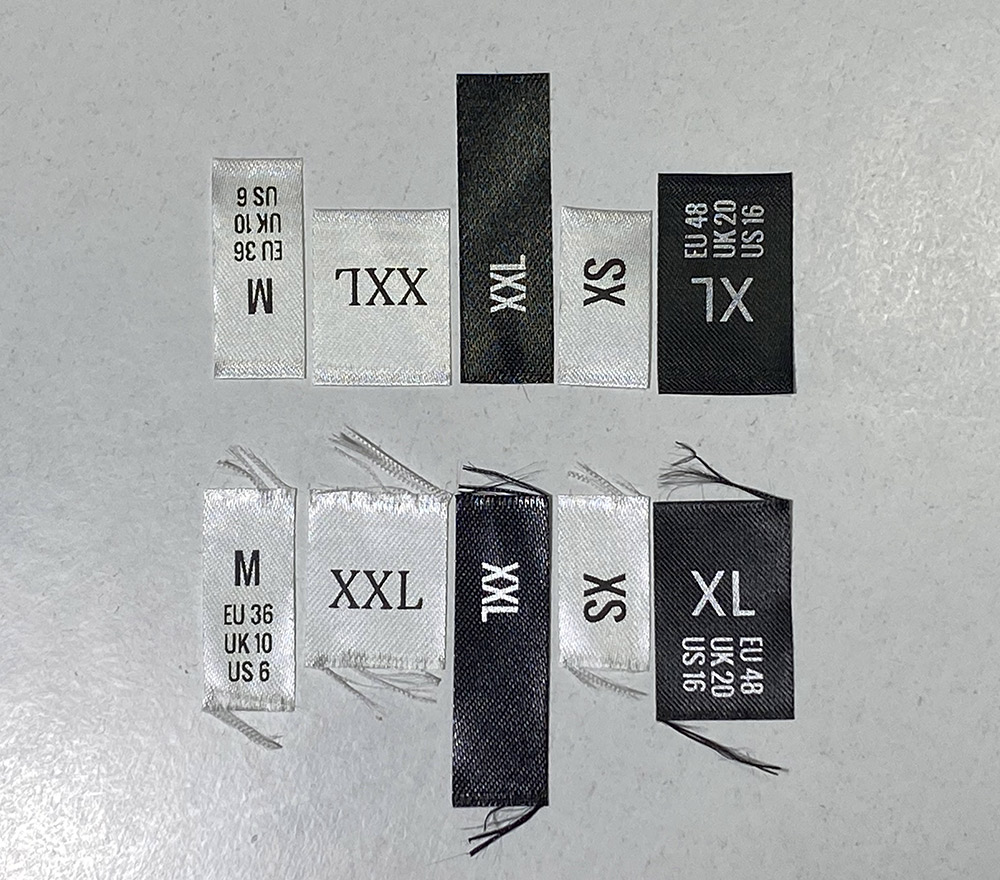 Textile labels with size for sewing on various clothing articles, footwear or clothing accessories. This type of textile label is made using the most advanced technologies in the digital printing field on a textile support. The labels are printed on a special satin by thermal transfer method, with an impressive print quality and high wash resistance.