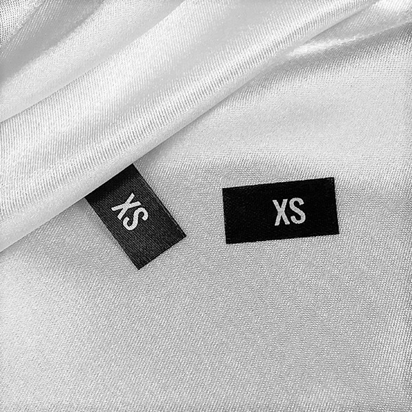 Labels with product number or size made to order from textile material, to be sewn on clothes. This type of textile label is made using the most advanced technologies in the digital printing field on a textile support. The labels are printed on a special satin by thermal transfer method, with an impressive print quality and high wash resistance.