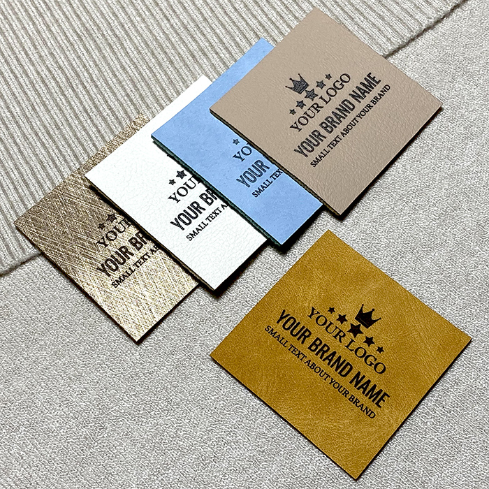 This Artificial leather label Model EP-M120 can be customized just in a few seconds, very simply and quickly using the graphic builder, where you can choose the color of the faux leather, you can insert your own logo or any other graphics with a complex design, and you can customize the label with your own text, for example your brand name, a slogan, manufacturer's name, and the country where your product was manufactured.