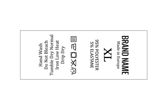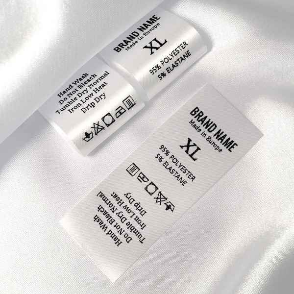 Satin washing care label provided with size indicator, customized with logo, Brand name, and care and washing instructions. This type of textile label is made using the most advanced technologies in the digital printing field on a textile support. The labels are printed on a special satin by thermal transfer method, with an impressive print quality and high wash resistance.