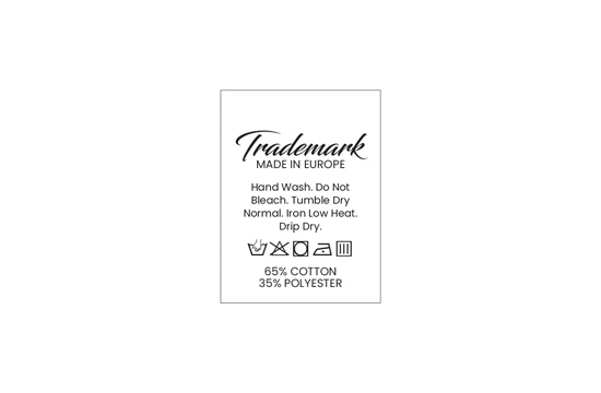 On this page you can customize the Laundry care label Model TC-M190 very simply and quickly, using the interactive graphic builder, where you have the possibility to insert your names and various symbols used in the textile industry, for which you can select a favorite font (inclined, artistic, regular, etc.), you can insert your logo/emblem.