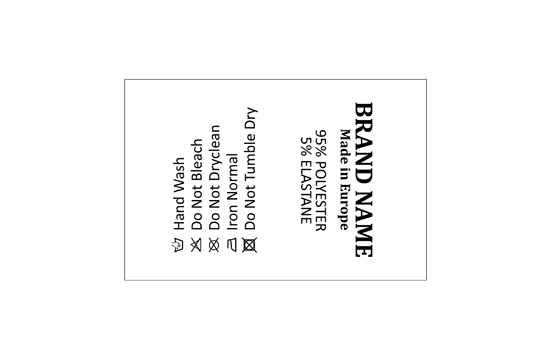 On this page you can customize the Laundry care label Model TC-M335 very simply and quickly, using the interactive graphic builder, where you have the possibility to insert your names and various symbols used in the textile industry, for which you can select a favorite font (inclined, artistic, regular, etc.), you can insert your logo/emblem.
