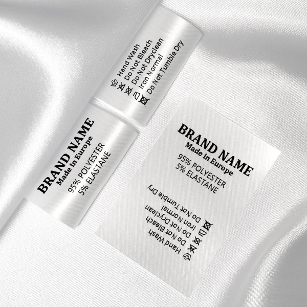 Washing care label made of fine white satin, printed with customized black text, suitable for various garments. This type of textile label is made using the most advanced technologies in the digital printing field on a textile support. The labels are printed on a special satin by thermal transfer method, with an impressive print quality and high wash resistance.