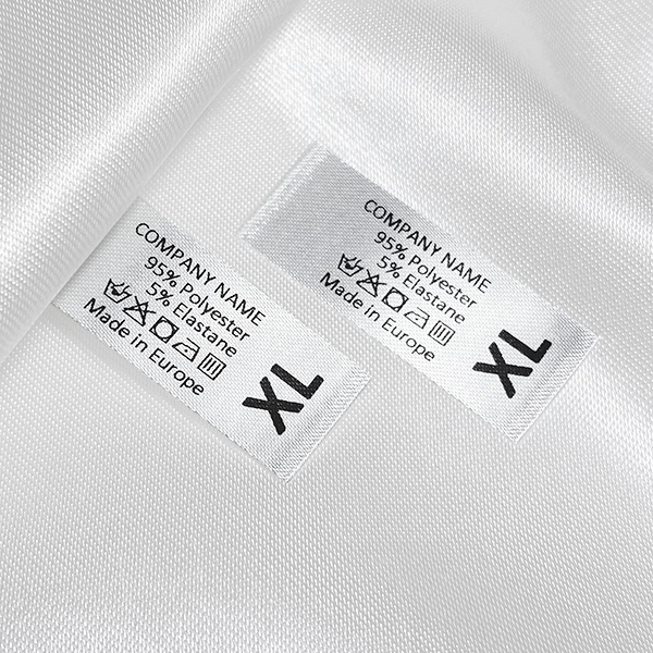 Laundry care and composition label with sizes and washing symbols made of high quality satin, for sewing on clothes. This type of textile label is made using the most advanced technologies in the digital printing field on a textile support. The labels are printed on a special satin by thermal transfer method, with an impressive print quality and high wash resistance.