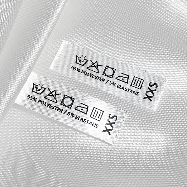 Laundry care label with symbols of washing and material’s composition, with the indication of the clothing item size, made to order from satin textile material with black print. This type of textile label is made using the most advanced technologies in the digital printing field on a textile support. The labels are printed on a special satin by thermal transfer method, with an impressive print quality and high wash resistance.