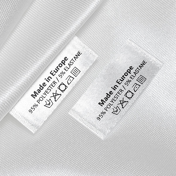Personalized satin label with washing and care symbols of the textile material from which the article of clothing is made, for sewing on clothes. This type of textile label is made using the most advanced technologies in the digital printing field on a textile support. The labels are printed on a special satin by thermal transfer method, with an impressive print quality and high wash resistance.