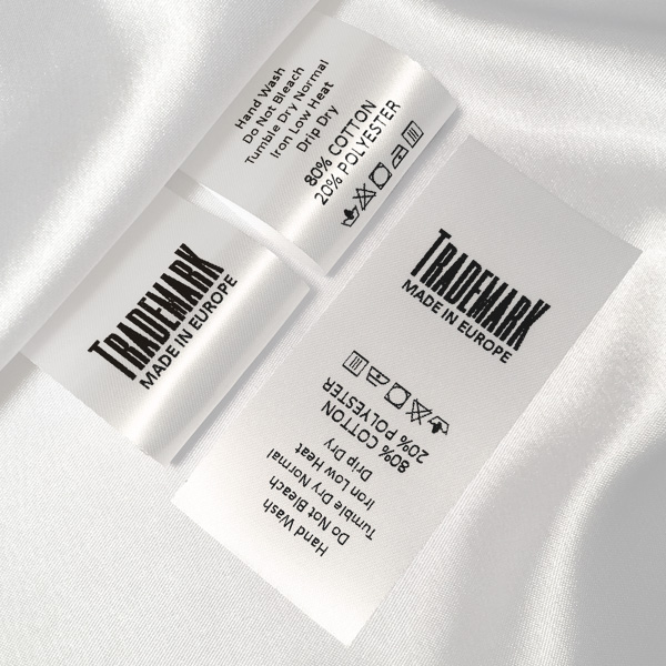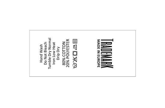 Laundry care label printed with Brand name, texts, laundry symbols and washing instructions, suitable for clothes, clothing accessories and more! This type of textile label is made using the most advanced technologies in the digital printing field on a textile support. The labels are printed on a special satin by thermal transfer method, with an impressive print quality and high wash resistance.