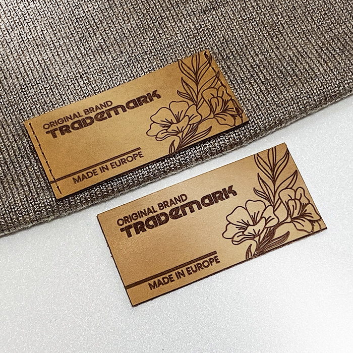 Natural leather label personalized with text or logo model EP-M3, suitable for clothes, shoes, hoodies, sweaters, hats, gloves and other clothing items. This leather label model is made of high-quality genuine leather, using the latest generation equipment and professional laser engraving or embossing methods.