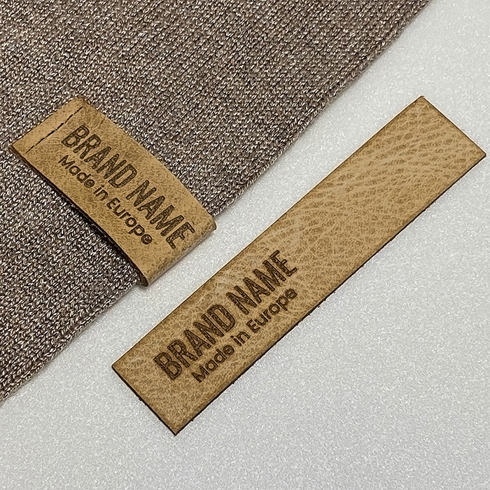Brand label made of natural leather model EP-M46, suitable for sewing on clothes, bags, shoes, various clothing accessories, personalized by laser engraving with the brand name. This leather label model is made of high-quality genuine leather, using the latest generation equipment and professional laser engraving or embossing methods.