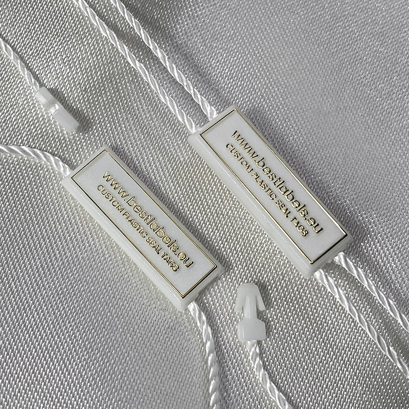 Custom plastic seal tag ST-M148 for fashion products, such as clothes, footwear, bags, jewelry, clothing accessories, etc.