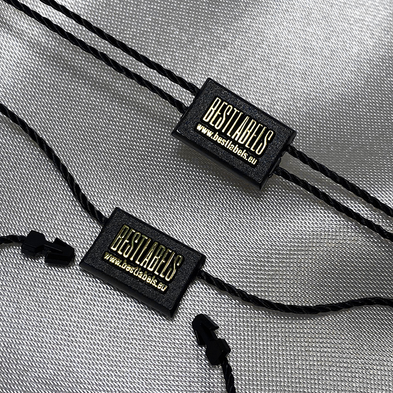 Custom plastic seal tag ST-M165 for fashion products, such as clothes, footwear, bags, jewelry, clothing accessories, etc.