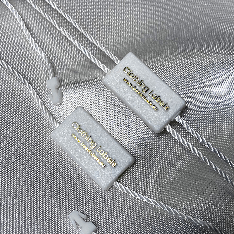 Custom plastic seal tag ST-M187 for fashion products, such as clothes, footwear, bags, jewelry, clothing accessories, etc.