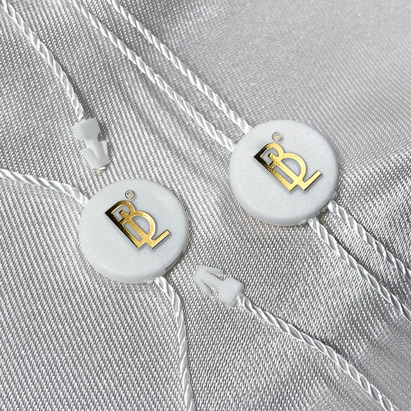 Plastic seal ST-M34 with a round shape, very elegant and beautiful customized on two sides with the Brand name or emblem, suitable for clothes, shoes, bags, etc. This type of seal is made of high quality materials, using the most advanced technologies in the field.