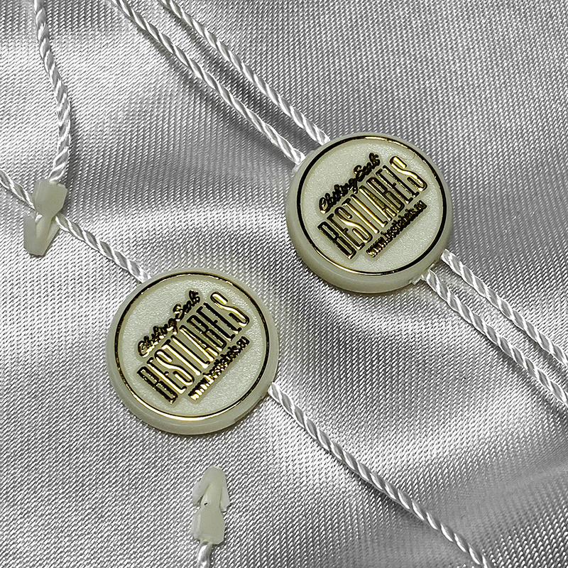 Plastic seal ST-M82 with a round shape, very elegant and beautiful customized on two sides with the Brand name or emblem, suitable for clothes, shoes, bags, etc. This type of seal is made of high quality materials, using the most advanced technologies in the field.
