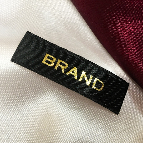 Custom label TL-M10 printed on satin fabric suitable for clothing, clothes accessories, and other textile products.