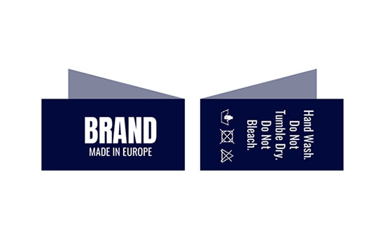 Woven label customized with the Brand name and composition texts and care symbols model Low Style, designed for clothes and different textile products. This type of woven label is made of high quality materials, using the most advanced technologies from Digital embroidery field at industrial level.