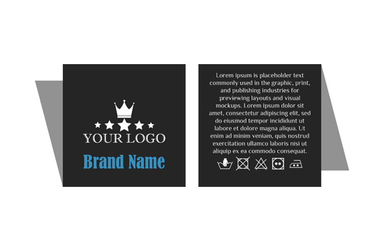 Textile label for clothes and various textile products folded in the middle model Scarce Style, customized with the Brand's name and emblem, but also with the maintenance and composition instructions. This type of woven label is made of high quality materials, using the most advanced technologies from Digital embroidery field at industrial level.