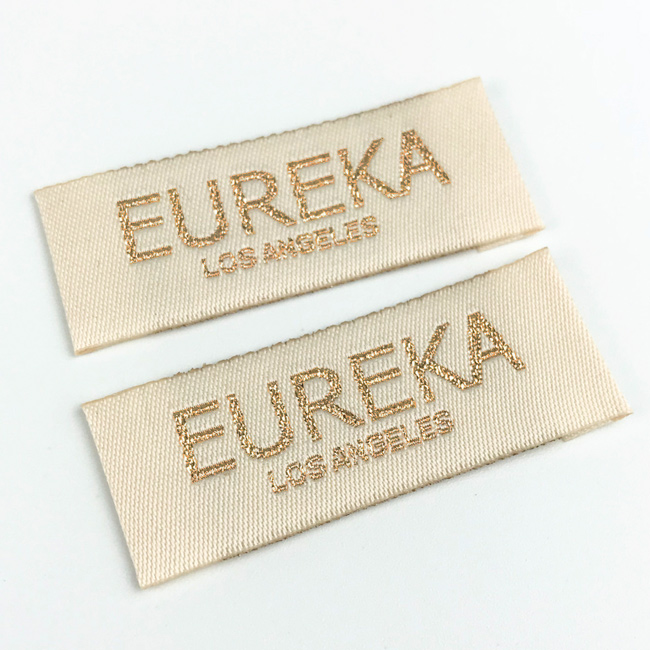 Clothing label made of damask, woven with embroidery thread or lurex thread model WL-M10, personalized with the Brand name or logo. This type of woven label is made of high quality materials, using the most advanced technologies from Digital embroidery field at industrial level.